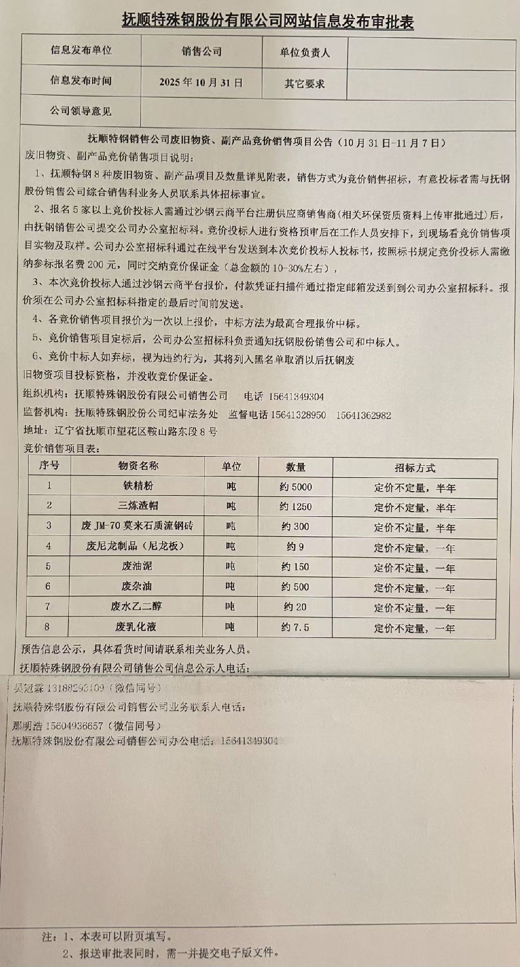 撫順特鋼銷售公司廢舊物資、副產(chǎn)品競(jìng)價(jià)銷售項(xiàng)目公告(10月31日-11月7日