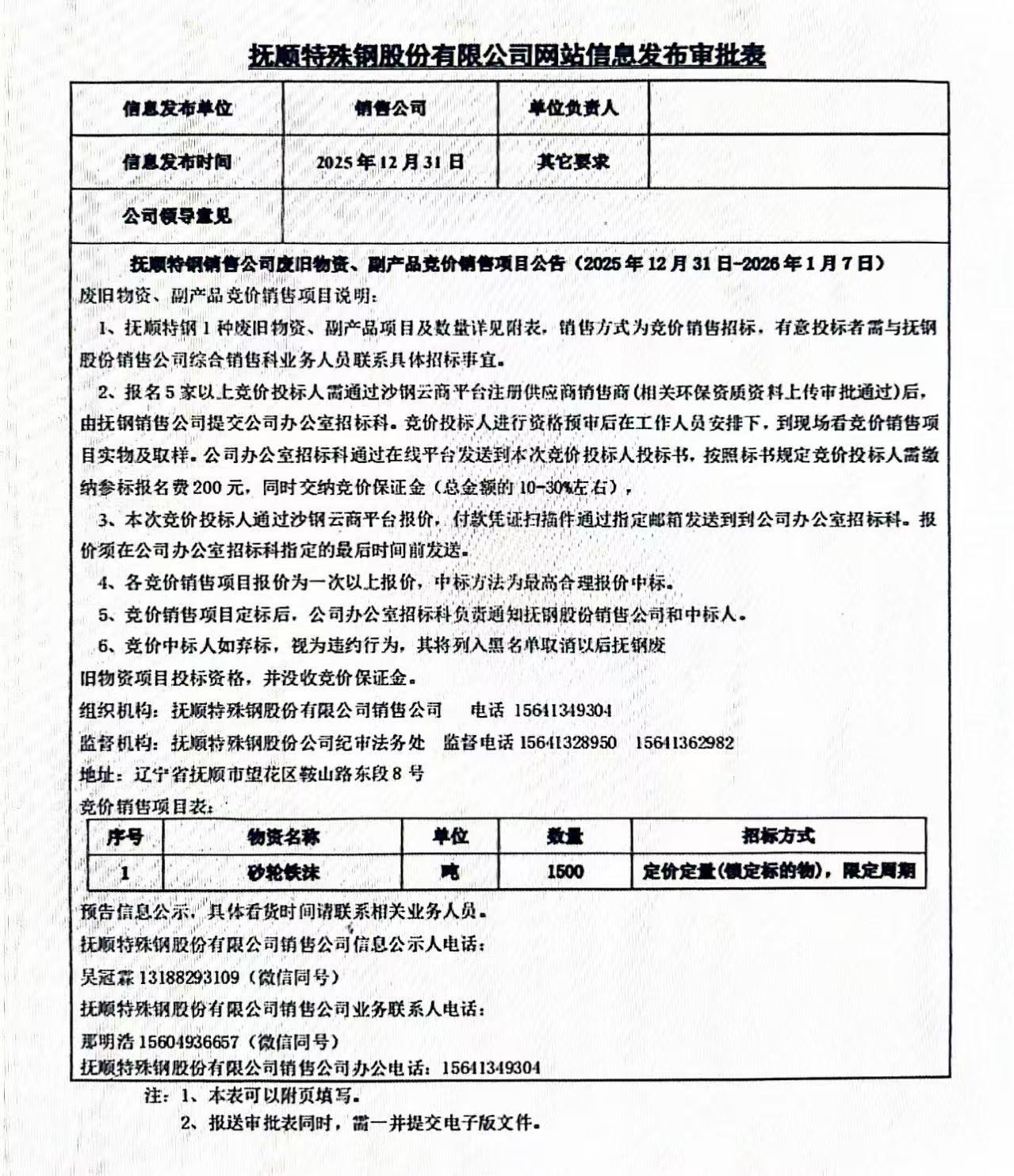 撫順特鋼銷售公司廢舊物資、副產(chǎn)品競價銷售項目公告(12月31日-1月7日)