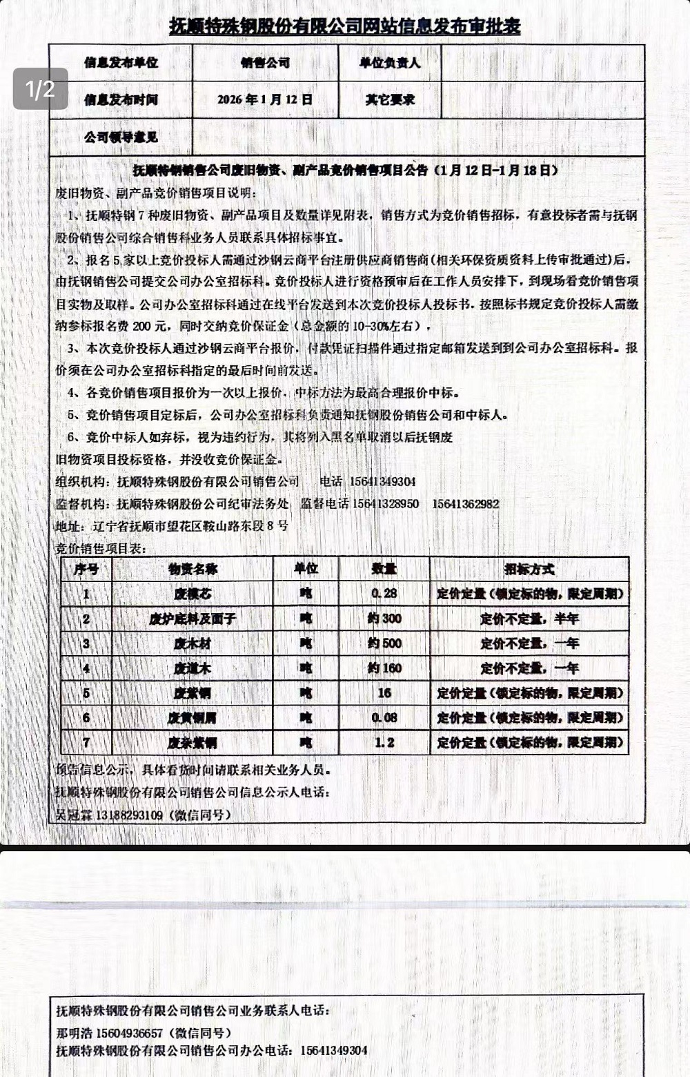 撫順特鋼銷(xiāo)售公司廢舊物資、副產(chǎn)品競(jìng)價(jià)銷(xiāo)售項(xiàng)目公告(1月12日-1月18日)