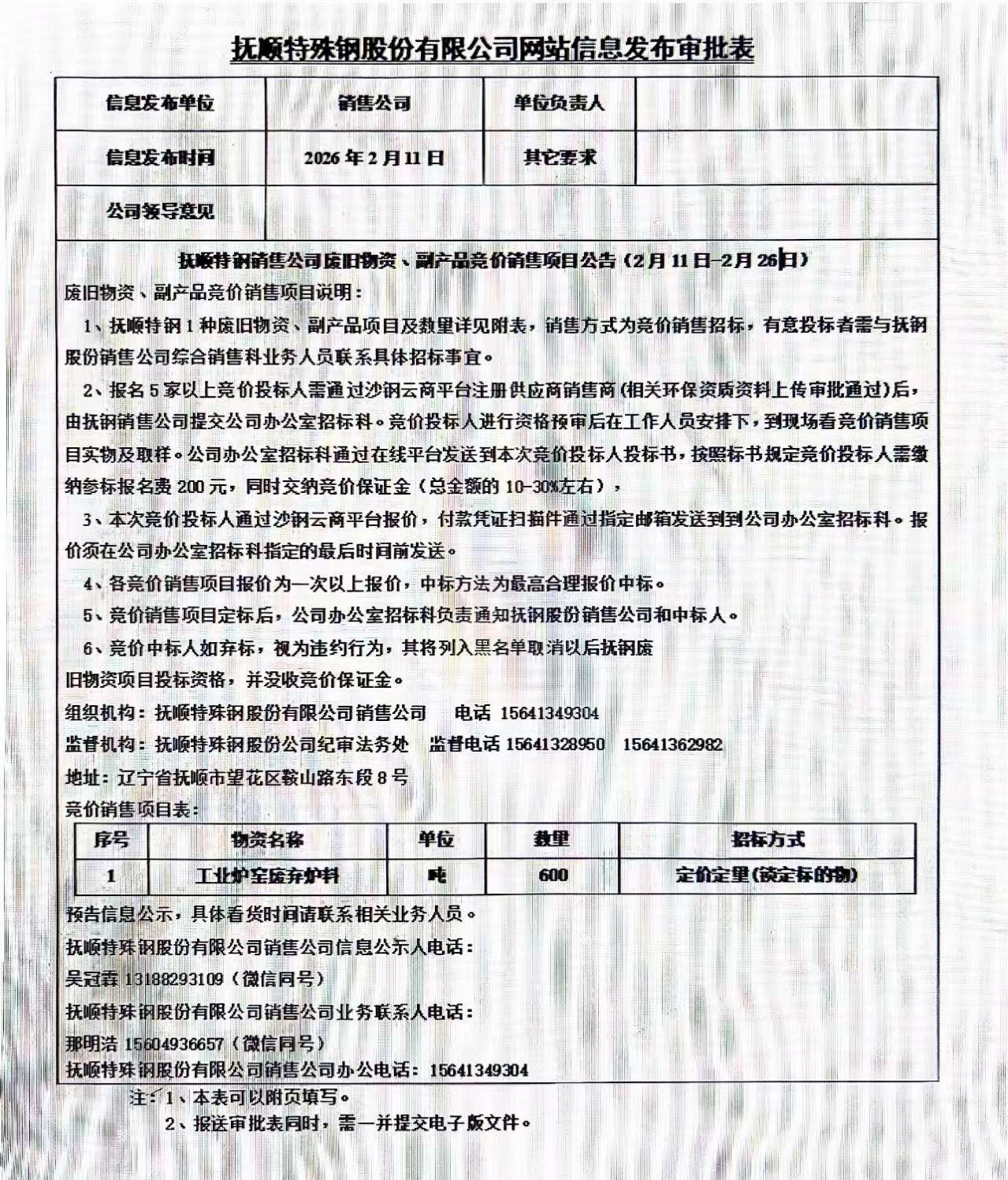 撫順特鋼銷售公司廢舊物資、副產(chǎn)品競價銷售項目公告(2月11日-2月26日)