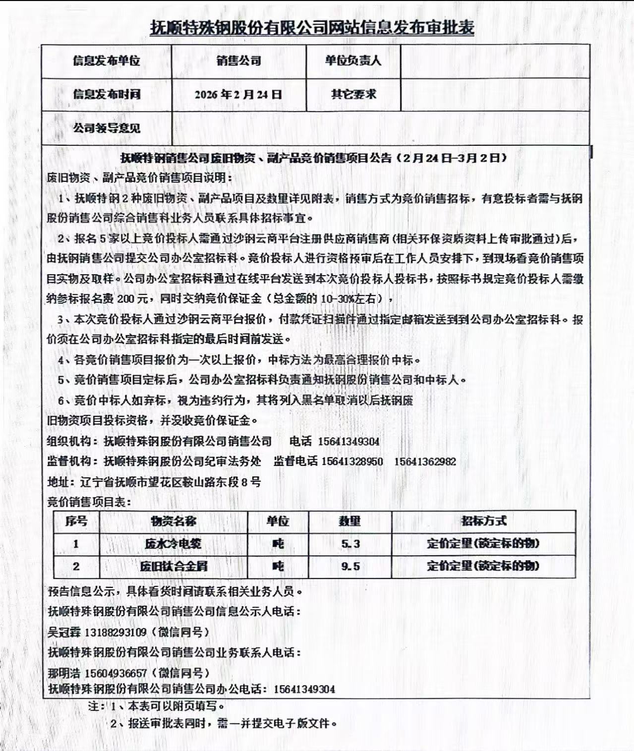 撫順特鋼銷售公司廢舊物資、副產(chǎn)品競價銷售項目公告(2月24日-3月2日)